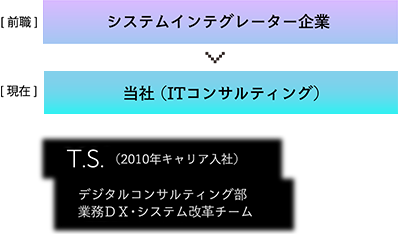 前職の大手システムインテグレーター企業にて、私はサービス業界向けの基幹システム開発を担当していました。システムの要件定義からリリースまで開発に関する一連の流れを経験した後、プロジェクトリーダーとして案件マネジメントを担うなど、マネジメントと開発実務の両方でスキルを身につけてきました。上流工程を経験する中で、次第により経営に近いポジションでお客さまの事業や業務の課題解決に資するシステムのあり方を検討する役割を担いたいとの思いが強くなり、転職を考えるようになりました。というのも、前職ではお客さまがシステム化の範囲や方針を決めた後に私たちがアサインされることが多く、経営や事業にとってどのようにシステムを位置づけるかという視座で考えることが難しかったのです。そのため経営課題の解決からIT戦略の策定に挑戦できる当社に転職することを決意しました。