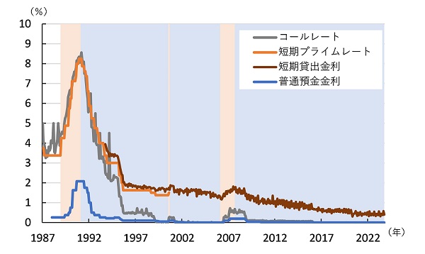 図中のシャドーは、短期プライムレートまたは短期貸出金利を基準に、オレンジを同金利のボトムからピークに至る「金利上昇局面」、ブルーを同金利のピークから次のボトムに至る「金利低下局面」として示している。貸出金利は概ねコールレートに連動しており(コールレートがゼロ金利に到達して以降は除く)、オレンジの期間では上昇、ブルーの期間では低下を続けてきた。ブルーの期間の圧倒的な長さは、日本経済が長期のデフレに陥り、日銀がコールレートをゼロあるいはマイナスに誘導せざるを得なかったことを象徴している。
