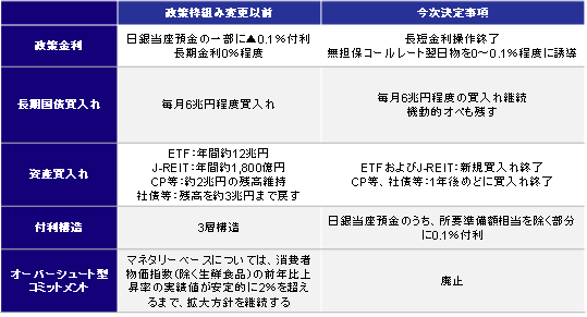 また、大規模緩和の見直しにともない、長期国債以外の資産買入れ方針やマネタリーベース拡大方針に関しても見直しが図られた。上場投資信託(ETF)や不動産投資信託(J-REIT)の新規買入れは終了し、コマーシャルペーパー(CP)や社債等に関しては、買入れ額を徐々に削減し、1年後をめどに買入れを終了することが決まった。消費者物価指数(除く生鮮食品、コアCPI)の前年比の実績値が安定的に2%物価目標を超えるまでマネタリーベースを拡大するという、オーバーシュート型コミットメントは、その要件を充足したものとして、声明文から削除された。