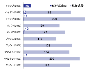 2025年1月20日、トランプ氏が第47代大統領に就任した。就任式当日には、大統領令26本に署名し、早速バイデン政権から大幅な政策変更が実施されることとなった。事前に予想されていた100本という数字1には及ばなかったものの、歴代政権と比較すると初日に発出された大統領令の数は際立って多く(図表1)、就任後すぐに政策を実行できるよう入念に準備してきたことが窺われる。