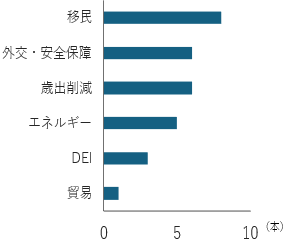 まず、初日に出された大統領令は、パリ条約からの脱退、米国第一の貿易政策、国境への軍隊派遣による移民抑制策など、概ねこれまでトランプ氏が発言してきた内容に沿ったもので、大きなサプライズは無かった。世界から注目された関税政策については具体的な措置はひとまず導入されず、記者とのやり取りの中で、メキシコ・カナダ・中国に対して2月1日から関税の引き上げを検討していると述べるに留まった。初日に署名された大統領令・覚書をテーマごとに分類すると、移民や外交関連が多く、関税政策については、貿易赤字の原因や第一次政権時における中国との合意履行状況の調査を命じた1本だけであった(図表2)。