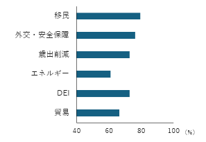 こうしたテーマごとの配分になった背景には、支持者の意向への配慮があったと推測される。図表3は、共和党支持者にトランプ氏が掲げる個別政策への支持率を尋ねた調査をもとに、テーマごとの平均的な支持率を筆者が計算したものである。共和党支持者の回答であるため、総じてどの政策テーマも賛同率は高いが、相対比較すると、図表2と同様に移民や外交関係が高く、関税についてはやや低いことが分かる。移民・外交政策への賛同率の高さには、他国のためではなく、国内でインフレや格差に苦しむ人々のために政策を実行してほしいという米国第一主義的な有権者の意向が表れていると考えられる。同調査の個別の関税政策についての質問を見ると、対中関税への賛同率は74%と高いものの、カナダ・メキシコへの関税引き上げへの賛同率は59%と、他の政策と比べて低い。広範な関税引き上げは、支持者の中でもインフレを再燃させるリスクが意識されている可能性がある。