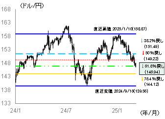 円金利の上昇と米金利の低下による日米金利差縮小から、ドル円相場は年初の1ドル=158円台から146円台まで円高・ドル安が進展した。安値と高値の値幅を用いて相場の反発・反落のポイントを見極めるフィボナッチリトレースメントからドル円相場の動向をみると、足元では61.8%水準の147円付近が心理的節目となっているようだ(図表1)。仮に更に円高・ドル安に進んだ場合、76.4%の144円台まで円高が急速に進む可能性もある。
