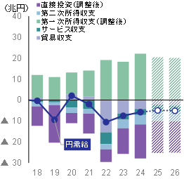 - (注)第一次所得(調整後)は、①直接投資の再投資収益、②証券投資収益の1/2を控除した金額。直接投資(調整後・ネット)は収益の再投資を除いた上で、対外直接投資から対内 直接投資を差し引いた金額。25・26年は予測値