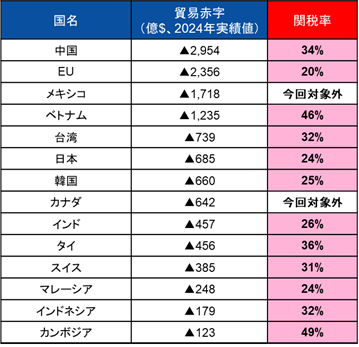 報道によれば、今回の相互関税が発表される直前まで、政権内では「対象国を絞った」相互関税を支持する穏健派と一律20%のユニバーサル関税を支持する強硬派の間で調整が続けられていた。結果としては両者の折衷案のような形になったものの、実際に提示された関税率は多くの国々で想定を上回る内容であったと言えよう。