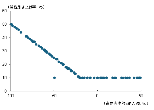 - また、関税と非関税障壁の結果である貿易赤字額のみを参照した計算であるため、相互関税という名称でありながら、現在の関税率の水準も相互関税率には影響しない。