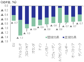 本稿では、4月2日発表当初の関税案(対米貿易黒字が大きい国への上乗せ分を含む)を前提にGDPへの影響を試算した(図表2)。その影響は、直接効果と間接効果に分けられる。直接効果は、自動車や鉄鋼・アルミ製品に対する25%関税と、20%の相互関税によるEUからの対米輸出減少幅を計算したものだ。間接効果は、米国の関税政策によって生じた、EU域外諸国の景気下振れによる波及効果を考慮したものである。直接効果・間接効果を合計したGDP下押し幅の合計はEU全体で▲0.7%と試算され、潜在成長率が1%台前半とされる欧州経済にとっては大きな打撃になる2。特に、ドイツやアイルランド等、製造業のウェイトが大きい国や対米依存度が高い国で影響が大きくなるだろう。2025年の欧州経済は、昨年に続き1%未満の低成長にとどまると予想される。