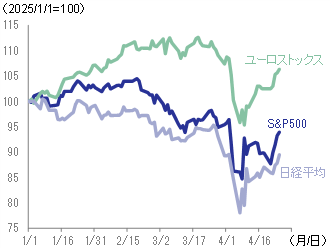 トランプ大統領の就任以降、米国は内向き志向を強め、国際社会への関与を低下させる姿勢が鮮明になっている。強硬な関税政策に加え、ウクライナ支援への消極姿勢など、米国の政策はトランプ氏の就任以前から様変わりした。こうした中で、欧州に対する市場参加者の期待は高まっているように見える。ユーロストックスは相互関税発表後に急落したものの、日本(日経平均株価)や米国(S&P500)に比べて底堅い(図表4)。米国に代わる投資先として、消極的な動機で資金を退避させている面もあるだろうが、EUレベルでの防衛費増額や、ドイツのインフラ投資基金設立を含む財政拡張への転換など、EUと加盟国のスタンスが明確に変化した点は間違いなく好材料だ。