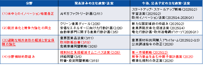 世界経済におけるEUの存在感を高めていく上では、エネルギー価格高騰により失われた競争力を取り戻せるかどうかがカギになる。今年1月、欧州委員会は競争力コンパスを公表し、競争力強化に向けて本格的に動き出した。競争力コンパスは今後の政策の工程を示した文書で、欧州委員会はこれに沿って次々と政策や法案を打ち出している(図表5)。しかし、効果が表れるまでに時間がかかる政策も少なくない。例えば、EUの単一市場化に向けて必要な規制簡素化や資本市場統合を達成するには、加盟国間での調整や国内の法整備等が求められる。改革をスムーズに進める上で障害となりそうなのが、主導する立場にあるドイツやフランスにおける国内政治基盤の不安定化である。例えばドイツでは、反EUを掲げる極右政党AfD(ドイツのための選択肢)が4月9日時点の世論調査で支持率トップになっており、改革がスムーズに進むかどうかは予断を許さない。