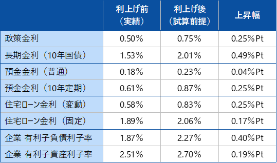 図表1は追加利上げ前後における各種金利の実績と試算前提をまとめたものだ。政策金利の引き上げ幅は0.5%から0.75%の0.25%Ptだが、長期金利(10年国債利回り)は足元の上昇を反映し、利上げ後の前提を2.01%(上昇幅0.49%Pt)とした。