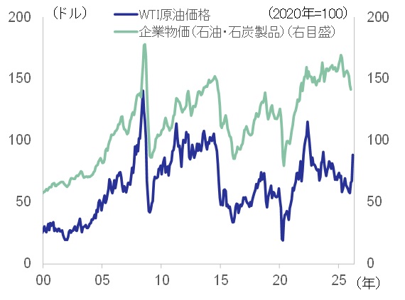 図表1 WTI原油価格と企業物価(石油・石炭製品)