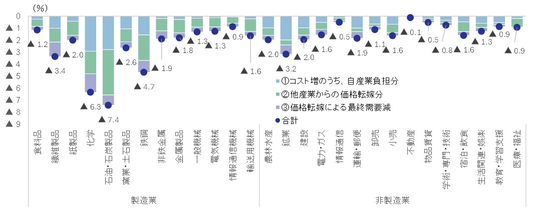 製造業の個別業種をみると、石油・石炭製品(▲7.4%)、化学(▲6.3%)、鉄鋼(▲4.7%)の落ち込みが目立つ。これらの業種は石油・石炭製品を中間投入として多く用いるため、他産業に相応の価格転嫁をしても自産業に負担が残りやすい(図中の①)。また、石油・石炭製品では他産業からの価格転嫁分(図中の②)が大きくなっているが、これには原油高に伴う輸送費の上昇や、精製・流通工程で用いる化学製品、電力などのコスト上昇が、運輸・郵便、化学、電力・ガスといった業種から価格転嫁されることが反映されているとみられる。