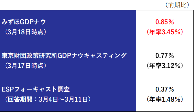 3月中旬時点の「みずほGDPナウ」は1~3月期GDPを前期比+0.85%と予測