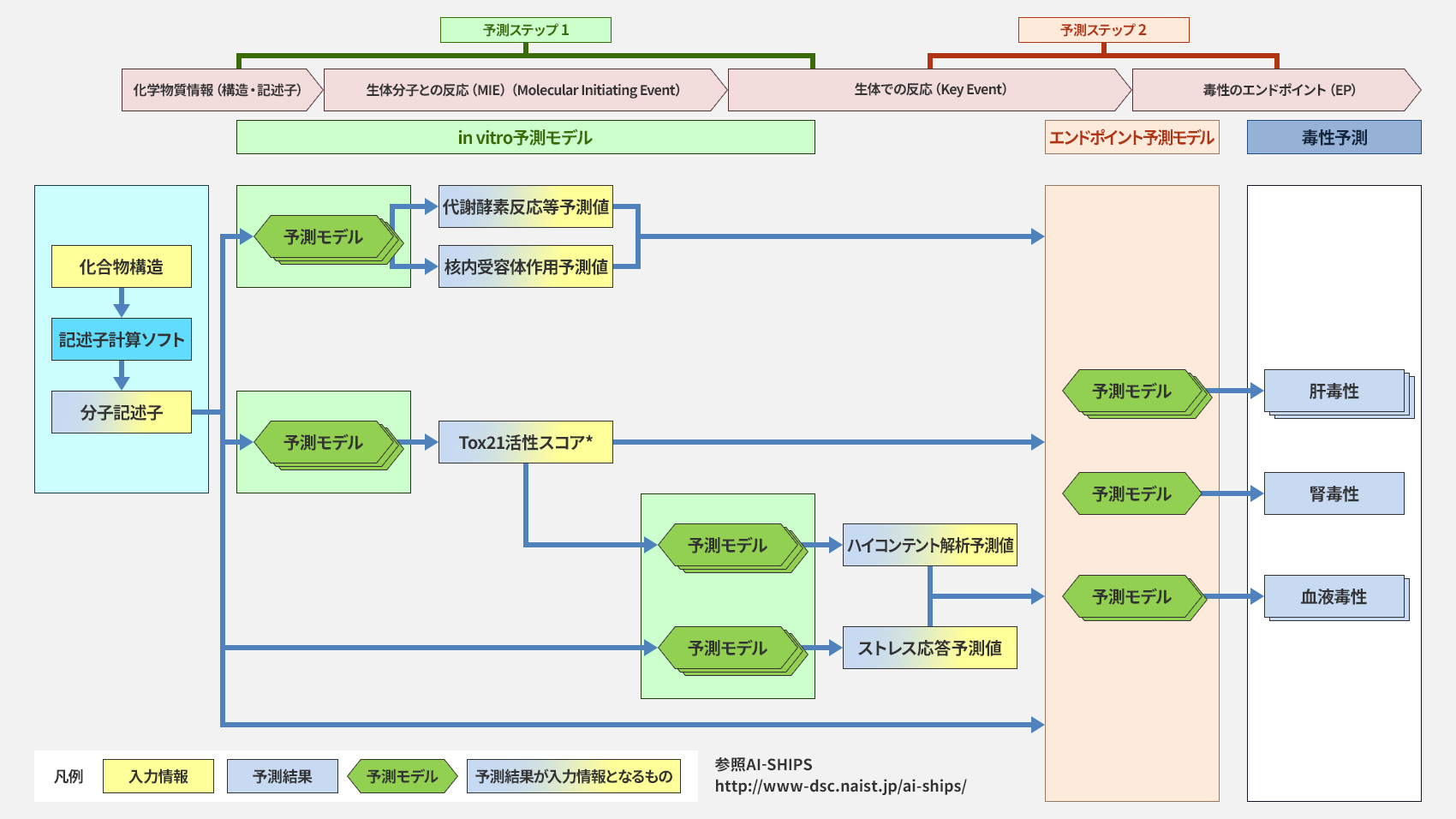 本図はAI-SHIPSプロジェクト全体の戦略である「2ステップ予測ワークフロー」の概念図です。このワークフローの最終目標は、動物実験(in vivo)の毒性を高精度に予測することにあります。そして、本稿で解説している「ストレス応答モデル」は、この大きな流れの最初のステップ(ステップ1)を構成する、重要な予測モデルの一つです。具体的には、まずステップ1で、化学構造の情報から、当社が構築したストレス応答予測モデルを含む、複数の細胞レベルの試験結果(in vitro指標)をAIで予測します。続くステップ2では、ステップ1で得られた複数の予測値を統合し、最終目標である動物での毒性(in vivo、例:ラット肝毒性)を推定します。このように、細胞レベルでの多様なメカニズム情報を経由することで、従来の「化学構造のみから直接in vivoを予測する」手法よりも、説明性を考慮した手法となっています。