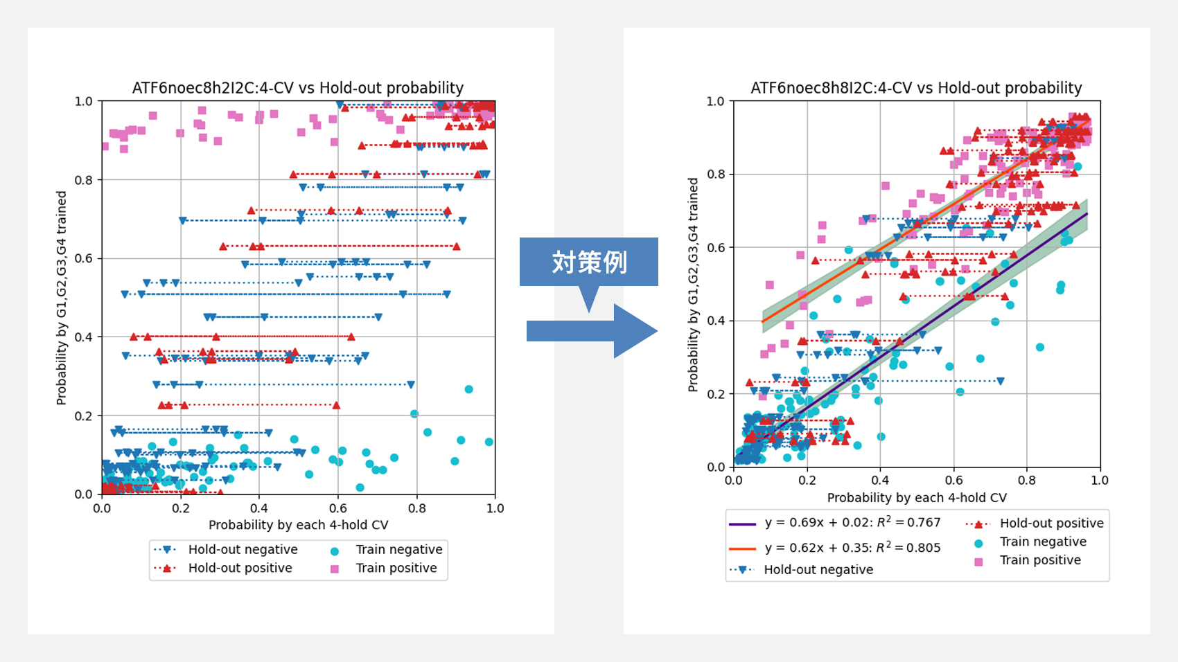 両確率の相関係数(回帰直線の傾き)が0.5〜1.5の範囲に収まらないハイパーパラメータは、指標値が高くても過学習の疑いがあるとして除外しました。こうすることで、データを「丸暗記」したモデルを排除し、未知化合物に対する汎用性を担保しています。