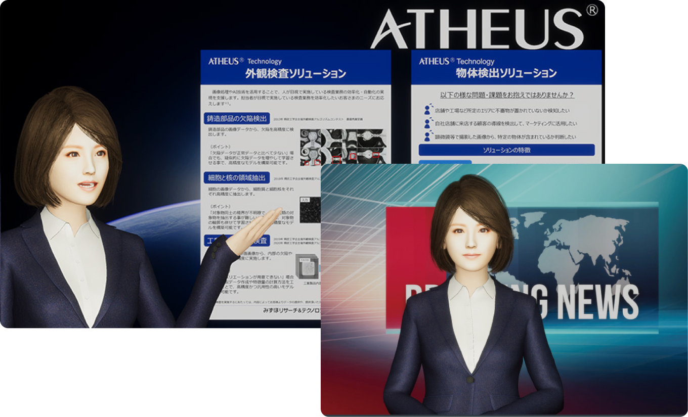 人の識別や視線把握による注目の理解など、様々なAI技術を活用したデジタルヒューマンを開発しています。当社の持つ顔合成技術によりニーズに合わせたデジタルヒューマンを提供し、対面業務の場においてもリモートワークを可能とする他、複数地点の接客を1人のオペレーターで対応可能とする等、接客業の長年の課題であった人手不足の解消、業務効率化にも貢献します。