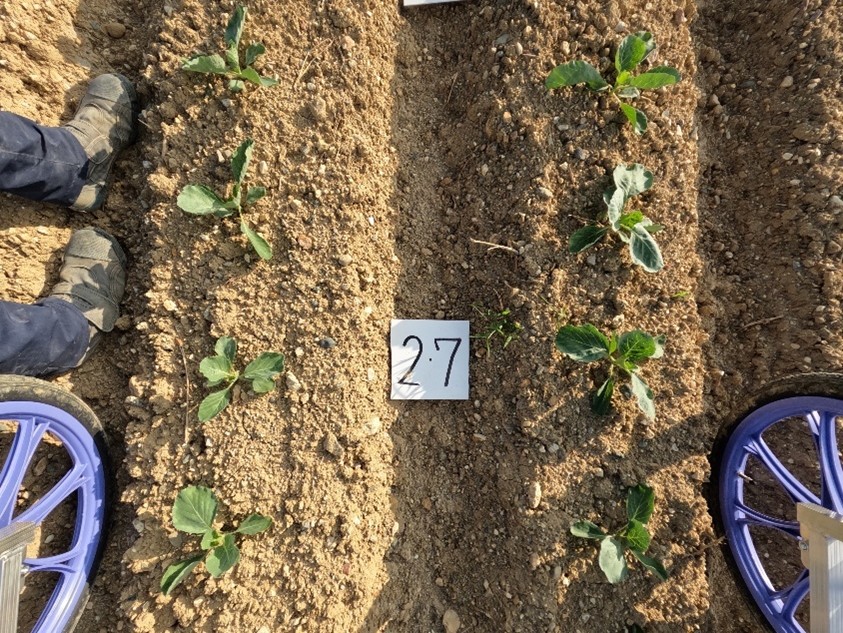 1. 配置の法則:キャベツは、2列(畝)に沿って植えられている。