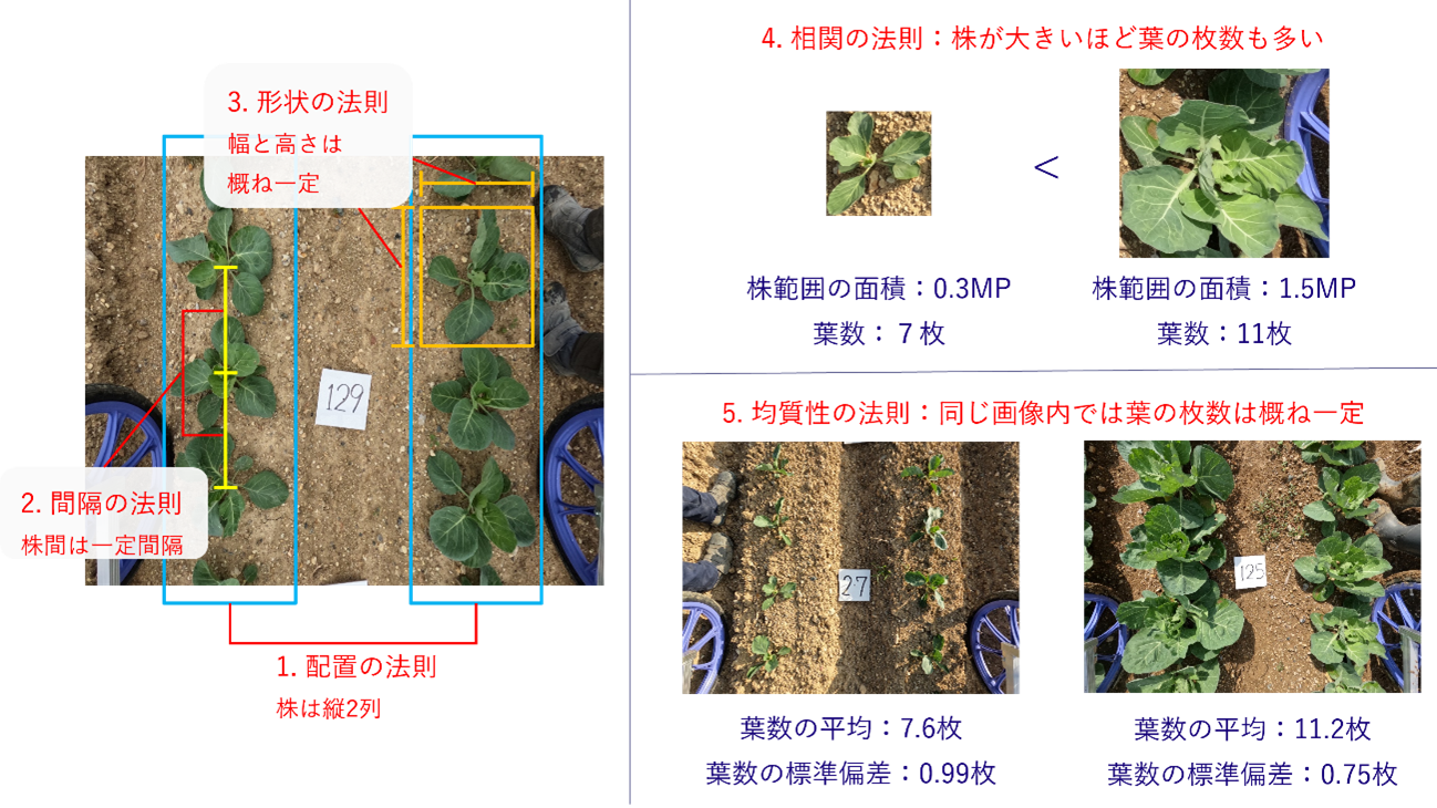 5. 均質性の法則:同じ画像に写る株同士で、育ち具合に極端な差はない。