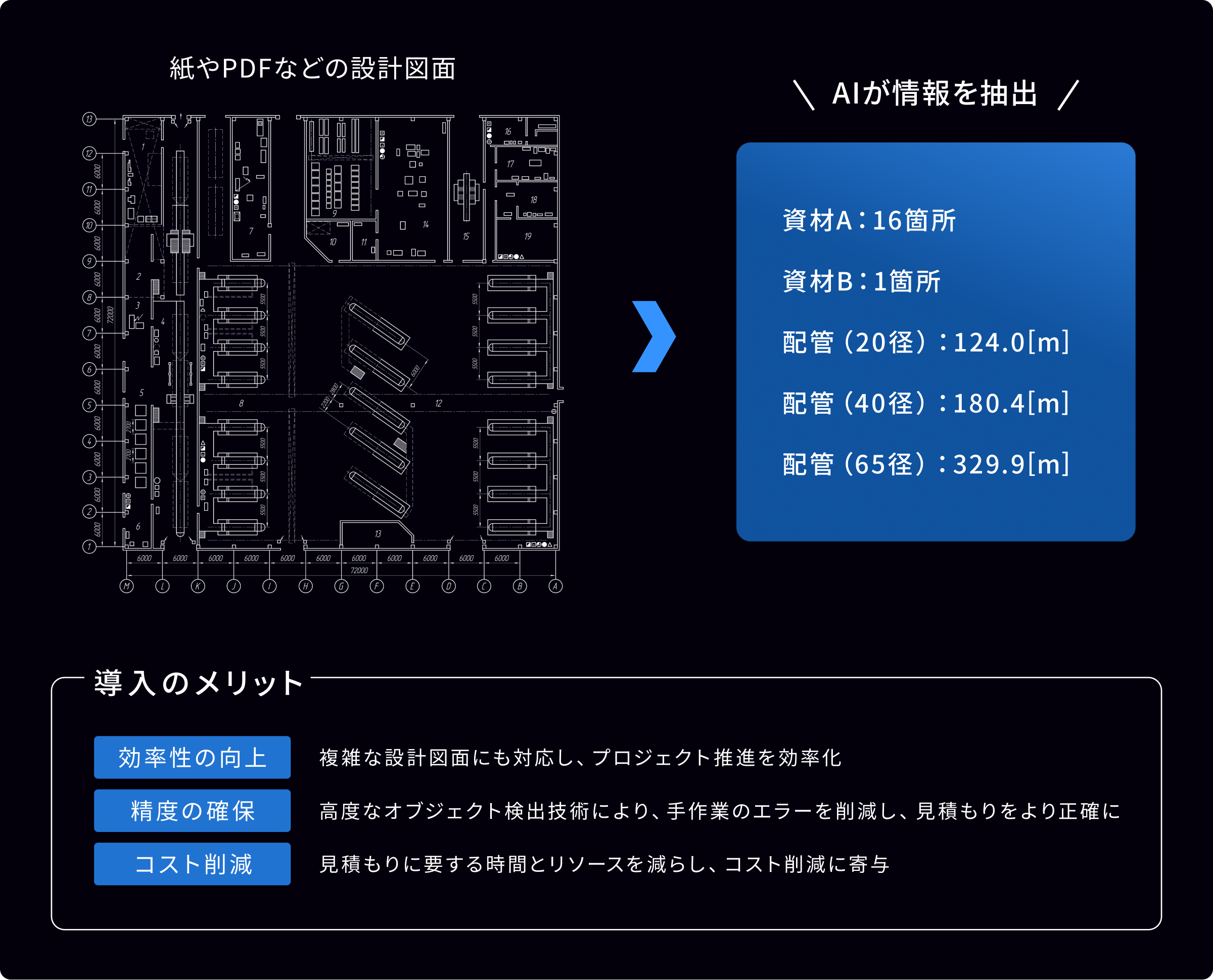 土木・建設現場において、設計図面から資材や配管の情報を手作業で抽出する積算業務は、作業負荷が大きく、属人性も高いという課題があります。