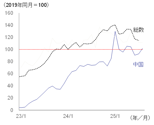 中国人訪日客数がコロナ禍前水準並みまで回復してきている。コロナ禍以降、中国人訪日客数の回復は他国・地域に比べて遅れていたが、2025年入り後は概ねコロナ禍前水準に戻り、8月は102万人と2019年同月比+1.8%の水準となった(図表1)。中国人訪日客の主な来訪目的(一般客1)をみると、コロナ禍直後は業務目的のシェアが高かったものの、2024年には観光・レジャー目的が8割程度を占めるようになり、コロナ禍前とほぼ同じ構成となった。一方で、旅行の手配方法には変化がみられる。2019年には観光・レジャー目的の中国人訪日客の3割が団体ツアーを利用していたが、2024年は1割にまで低下し、個別手配がほとんどを占めるようになった。さらに、一人当たり消費支出(一般客)の相対的な位置にも変化があり、中国は米国を下回ったほか、香港や台湾との差も縮小している(図表2)。