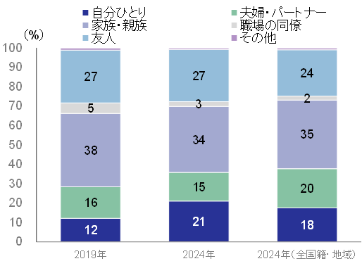 一方で、同行者に対する回答をみると、「自分ひとり」の割合が高まっている。2019年には「自分ひとり」との回答割合は12.2%であったが、2024年には2割超まで拡大した(図表3)。2024年度の個票データを確認すると、「自分ひとり」との回答は、20代・30代が7割を占めており、男女比はやや女性の割合が高かった。また、「自分ひとり」と回答した者のうちリピーター割合は58.2%と、中国人訪日客全体平均(53.7%)よりも4.5pt高いほか、訪日回数が10回以上との回答割合をみても12.7%と、同じく中国人訪日客全体平均(8.8%)より3.9pt高くなっており、再訪意欲の高さがうかがえる。