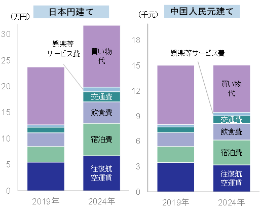 一方で、購入単価・購入率の上昇が目立つ品目は「靴・かばん・革製品」と「衣類」で、ハイエンドブランドの購入拡大が影響しているとみられる。また、「宝石・貴金属」や「時計・フィルムカメラ」は、購入率は低いものの、購入単価が大幅に上昇している。こうした高額品の購入拡大は、円安を受けて日本での購入の割安感が高まったことが要因と考えられ、これらの品目が買い物代全体に占める割合は28%(2019年)から51%(2024年)にまで上昇している。