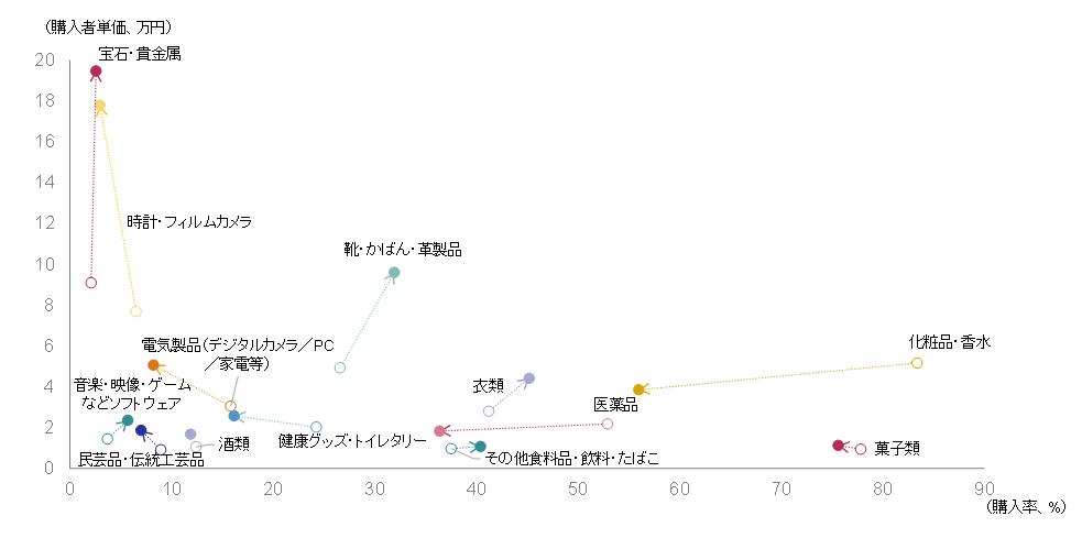 買い物代の内訳をみると、かつての「爆買い」対象品の購入が縮小していることがみてとれる。図表5は、縦軸に購入者単価(当該品目を購入した人の平均購入単価)、横軸に購入率(全体のうち何割の人が当該品目を購入したか)をとり、品目別にプロットしたものだ。これをみると、「化粧品・香水」、「医薬品」、「健康グッズ・トイレタリー」、「電気製品」の購入率が低下していることがわかる。EC(電子商取引)の発達や中国国内製品の品質向上が、これらの品目を日本で購入する必要性を低下させたと考えられる。