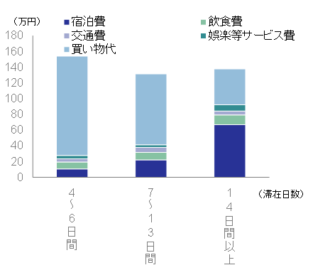 2024年度の個票データを用いて、中国人訪日客の中の高付加価値旅行者(訪日1回当たりの日本国内での総支出額が100万円以上の旅行者、日本政府観光局(JNTO)による定義)をみると、滞在期間2週間未満と2週間以上では費目別の構成が全く異なることがみてとれる。滞在期間2週間未満の層では買い物代が全体の7~8割を占める一方、滞在期間2週間以上の層では3割にまで低下し、宿泊費や飲食費、娯楽サービス費の占める割合が高くなっている(図表6)。