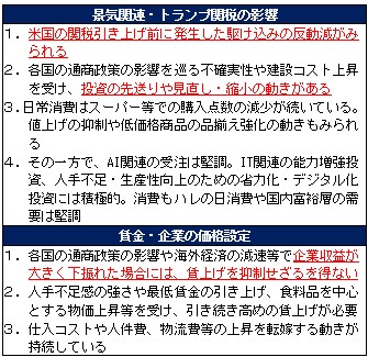 9月の金融政策決定会合では、2名の審議委員が政策金利を0.75%に引き上げるよう提案したが、植田総裁など執行部をはじめとするその他の政策委員は政策金利の据え置きを支持し、拙速な追加利上げは避けるべきとの姿勢を崩さなかった。こうした利上げ先送りの判断は、10月末の金融政策決定会合でも維持される可能性が高いとみている。判断材料の1つとなるのが、10月上旬に開催された日銀支店長会議での報告だ。同会議では賃上げが継続していることが報告される一方で、一部に消費の弱含みや投資を先送りする動きがみられるとの報告がなされた。トランプ関税の影響による経済・物価の下振れを警戒する日銀は、支店長会議での報告をその兆候と受け止めた可能性がある(図表1)。