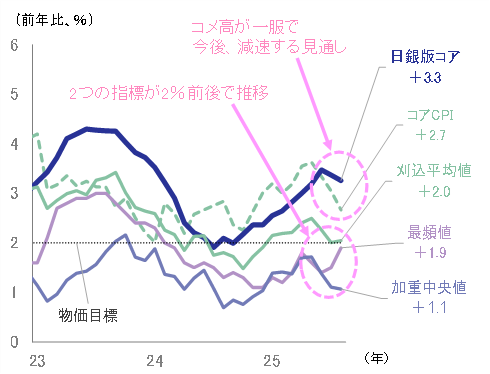 しかし、価格変化の極端な部分(品目別価格変動分布の上下各10%)を除外した「刈込平均」や品目別価格変動分布において最も頻度の高い価格変化率である「最頻値」は2%前後に留まっており、価格上昇率の高い順にウエイトを累積して50%近傍にある値を示す「加重中央値」に至っては1%台前半で推移している。上述したコアCPIや日銀版コアCPIについても、コメ価格の高騰一服(前年比プラス幅の縮小)によって、今後は上昇率が低下する見通しだ。日銀は、「基調的なインフレ率を捕捉するための指標」としてこれらの指標の動きを公開しており、これらの指標も含めて基調的な物価上昇が安定的に2%を達成したと総合的に判断できるようになるには、時間が必要であろうと筆者は考える。