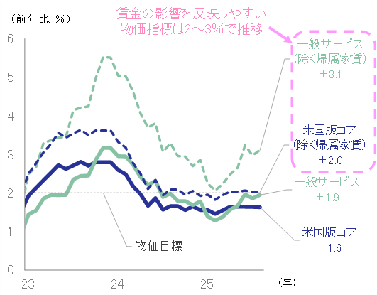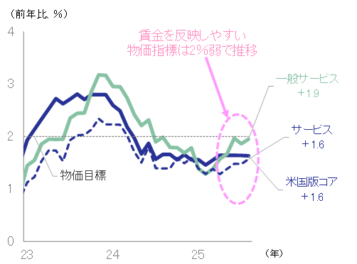日銀は、基調的な物価上昇を把握するうえで、賃金を反映しやすい物価指標にも注目している。その1つが、酒類以外の食料とエネルギーを除いた「米国版コアCPI」である(図表4)。米国版コアCPIは生鮮食品以外の食料品も除くため、例えば足元で言えばコメ価格高騰の影響を取り除いた物価動向をみることができる。また、米国版コアCPIは、財の支出で多くの割合を占める食料品やエネルギーを除いているため、サービス価格の動きを強く反映した指標となる。そして、サービス価格は財価格よりも人件費比率が高いことから、米国版CPIは賃金上昇の価格転嫁が反映されやすい物価指標ということになる。米国版CPIのほかにも、CPIの中の「サービス価格」をみたり、サービス価格のうちさらに民間が提供するサービスに絞った「一般サービス価格」をみたりすることで、より直接的に賃金の価格転嫁の度合いを推察することができる。こうした賃金を反映しやすい物価指標の最近の動向をみると、いずれも足元では前年比上昇率が2%を下回ったままの状態が続いている。