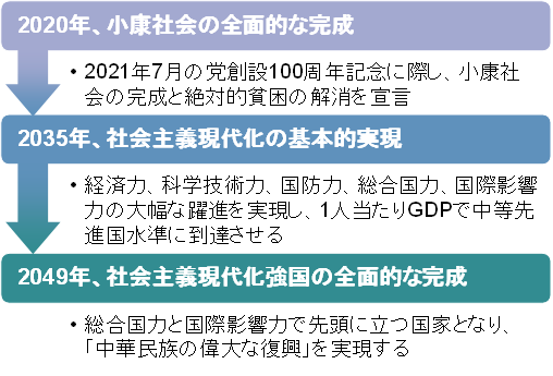 中国にとって第15次五カ年計画は、「小康社会(ややゆとりある社会)の全面的な完成」(2021年7月にその完成を宣言)から2035年の目標である「社会主義現代化の基本的実現」に向けた折り返し地点に当たる(図表1)。このため、『建議』は第15次五カ年計画をこの目標実現のための「基礎を打ち固め、全面的に力を発揮する重要な時期」と位置づけており、「質の高い発展」や「科学技術の自立自強」など7つの主要目標を掲げた上で、「2035年までに経済力、科学技術力、国防力、総合国力および国際影響力の大幅な躍進を実現し、1人当たりGDPで中等先進国水準に到達させる」方針を再確認している(文面としては、現行の第14次五カ年計画の表現から「国防力」と「国際影響力」という言葉が追加された)。具体的な政策でも継続性を重視する傾向がみられた。